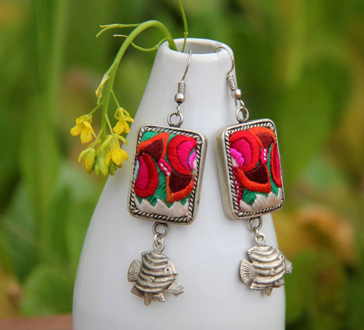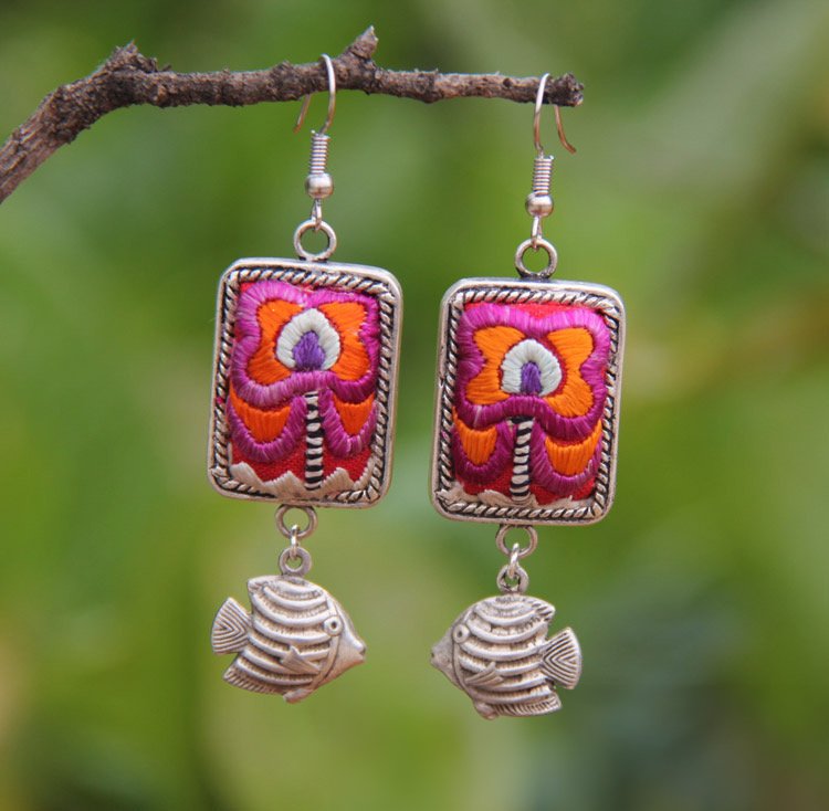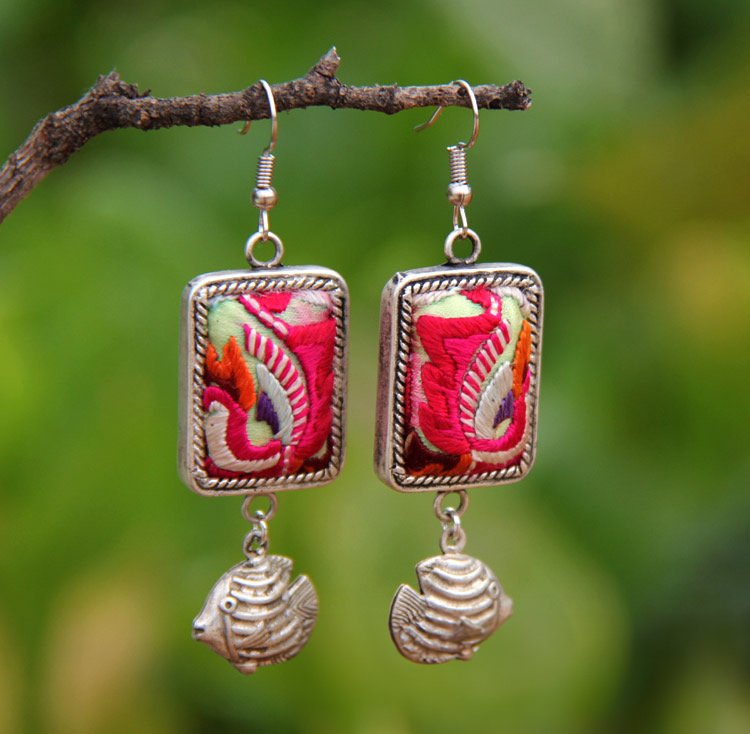 • Miao ethnic style earrings clothing accessories retro old Miao silver inlaid handmade embroidery pieces old embroidery